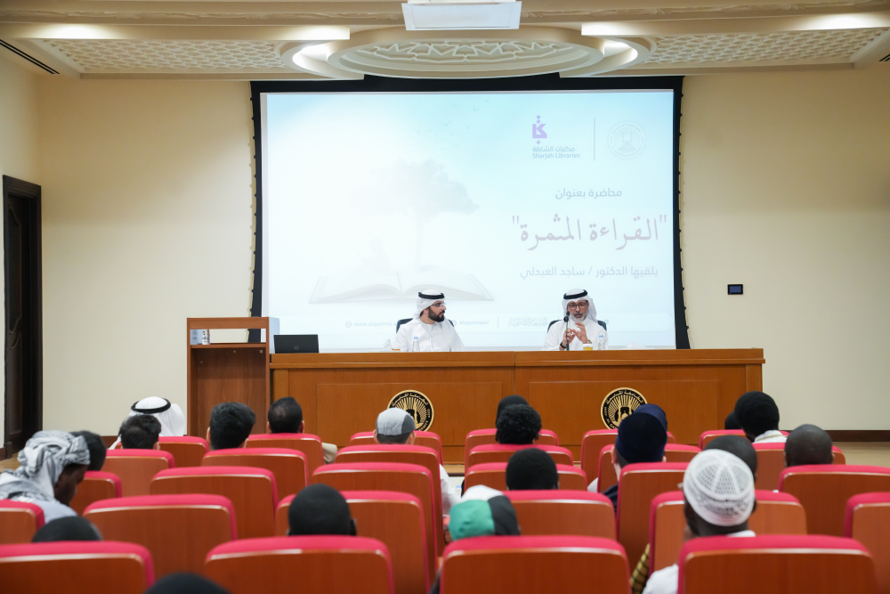 وتواصلت الفعاليات القرائية بتنظيم محاضرة حملت عنوان ( القراءة المثمرة ) وجرى تنظيمها في إطار التعاون والتنسيق  مع مكتبات الشارقة، وتحدث في المحاضرة الدكتور ساجد العبدلي عن أهمية  القراءة ودورها في إثراء العقل والمسيرة الإبداعية للقارئ، مرتكزاً على خبراته ومسيرة حياته في مجال الطب النفسي وتأليفه في القراءة الذكية واهتمامه بالنشر والتأليف .
